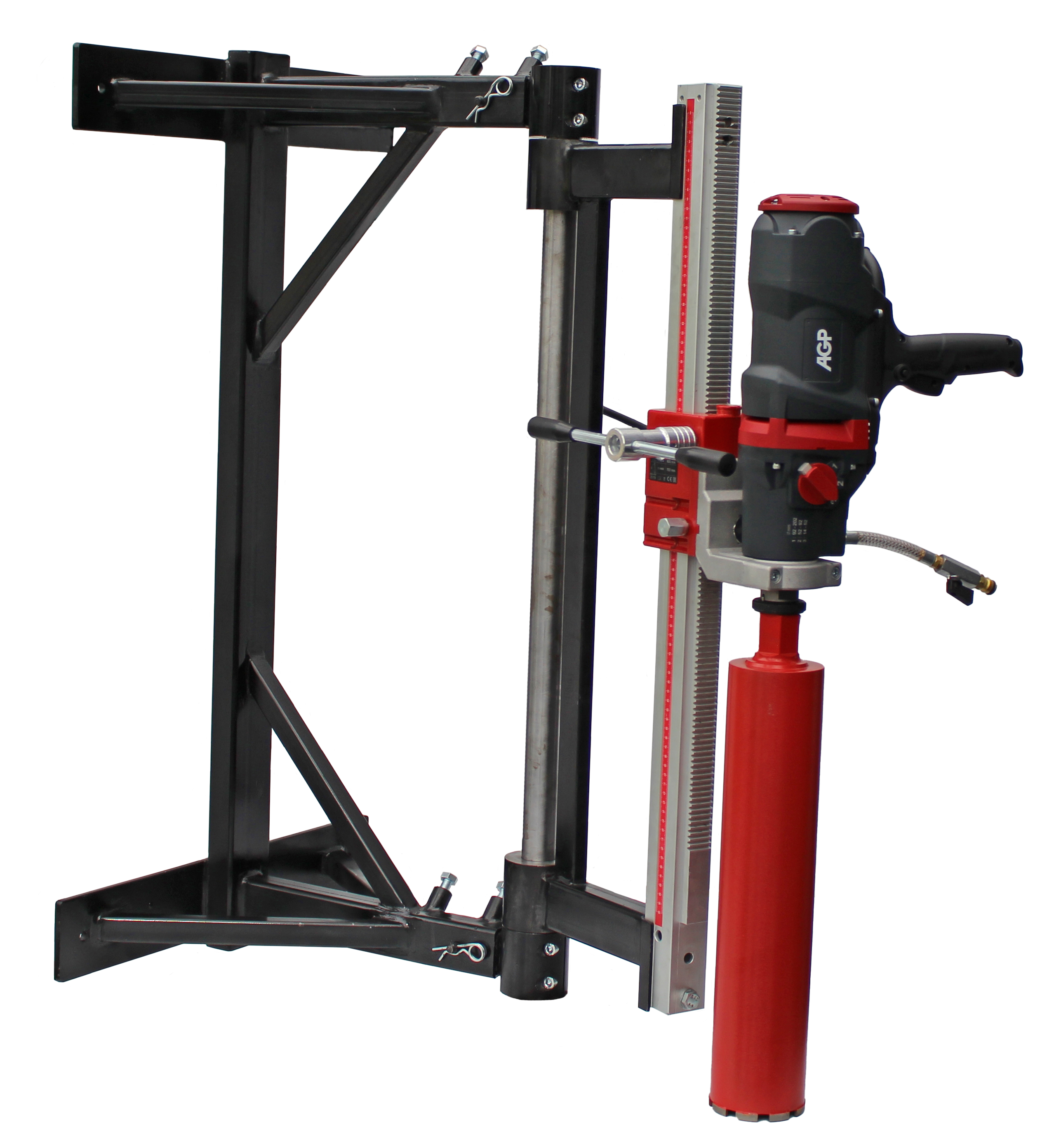 Das AGP-Wandbohrgerät Typ WB steht für exakte Bohrungen in allen Gesteinsarten und in größeren Durchmessern. Eine hochwertige Stahlkonstruktion mit einer präzisen Führungsstange garantiert Langlebigkeit. Der Bohrmotor AGP DM8P ist leistungsstark, besitzt drei Gänge und garantiert Bohrungen bis 200 mm.
